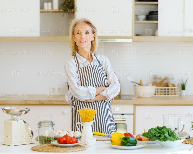Портрет красивой пожилой женщины, стоящей на кухне и улыбающейся в камеру во время приготовления здоровой пищи