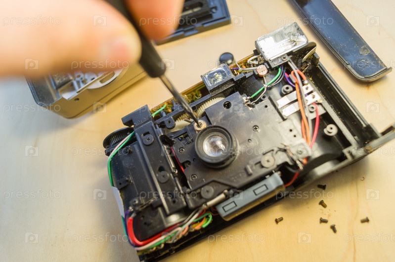 Ремонт компактного фотоаппарата. Откручивание винтов на деталях камеры с помощью отвертки. Выборочный фокус