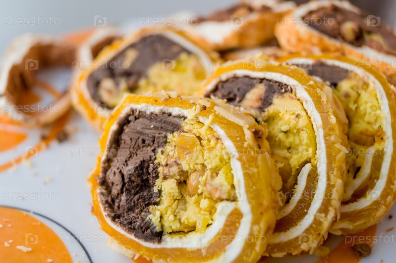 Восточные сладости, рулет из пастилы с щербетом и орехами. Сладкий десерт. Мягкий фокус