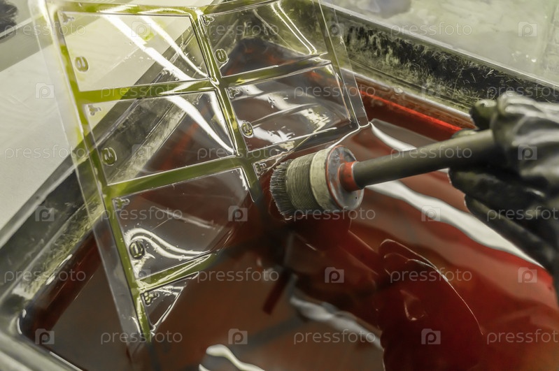 Процесс ручной промывки полимерных печатных форм в специальном растворе, растворяющем краску. Работа в типографии. Выборочный фокус
