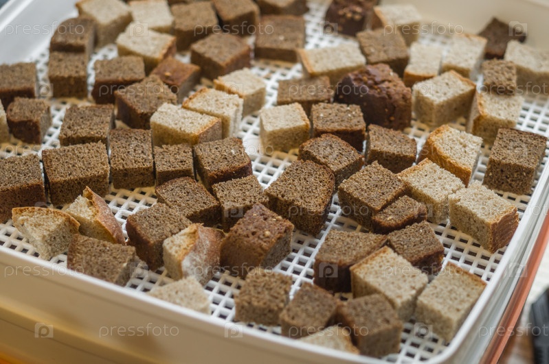 Сушка сухарей в электросушилке. Обезвоживание крекеров из белого и черного хлеба. Выборочный фокус