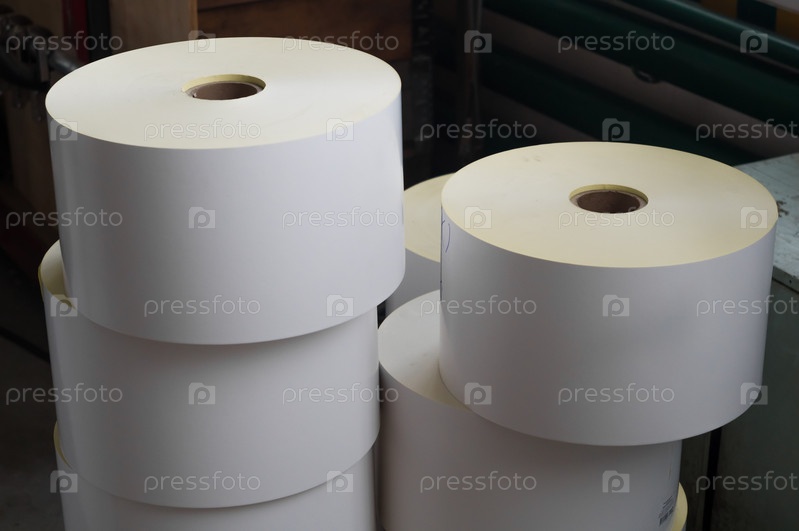 Рулоны белой офсетной самоклеящейся бумаги для печати цветной этикетки. Бумажные валики на картонном сердечнике. Склад бумажных материалов типографии. Выборочный фокус