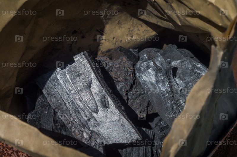 Натуральный уголь в бумажном пакете. Экологически чистый уголь для барбекю и гриля. Топливо для барбекю. Натуральный твердый древесный уголь. Выборочный фокус