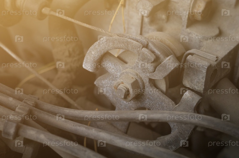 Дроссельный механизм старого автомобильного двигателя. Крупный план привода дроссельной заслонки. Грязные части старого мотора. Ремонт и обслуживание двигателей автомобилей в ремонтной мастерской. Выборочный фокус