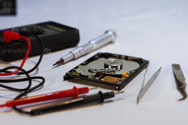 Жесткий диск разобранный для ремонта, вольтметр, запасные части и инструменты для ремонта