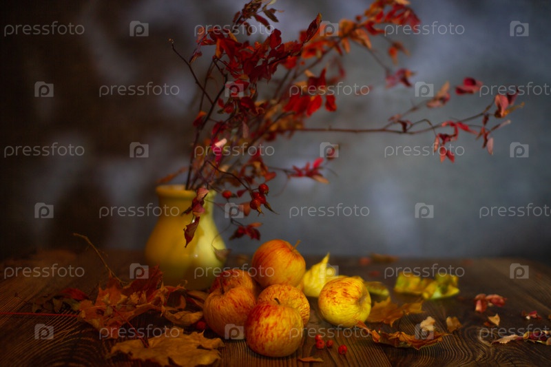 Осенний натюрморт. Увядшие яблоки, сухие листья и ветка шиповника на столе