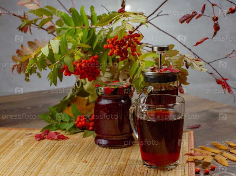Чашка с горячим чаем, чайник и банка с вареньем на столе
