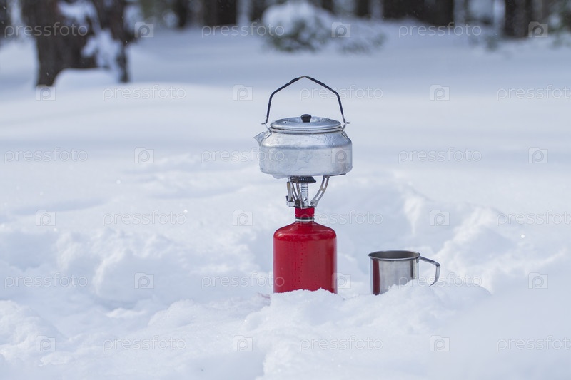 Пикник зимой. Чайник, газовая горелка и кружка на фоне снега