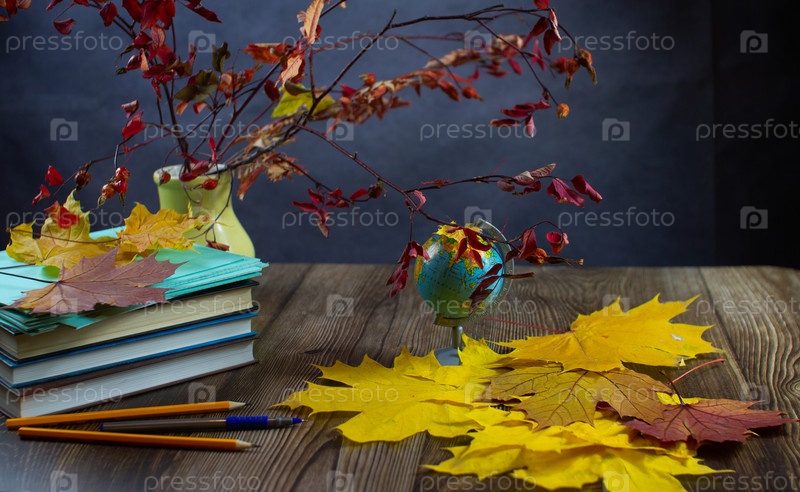 Скоро в школу. Сухие листья и канцелярские принадлежности на столе