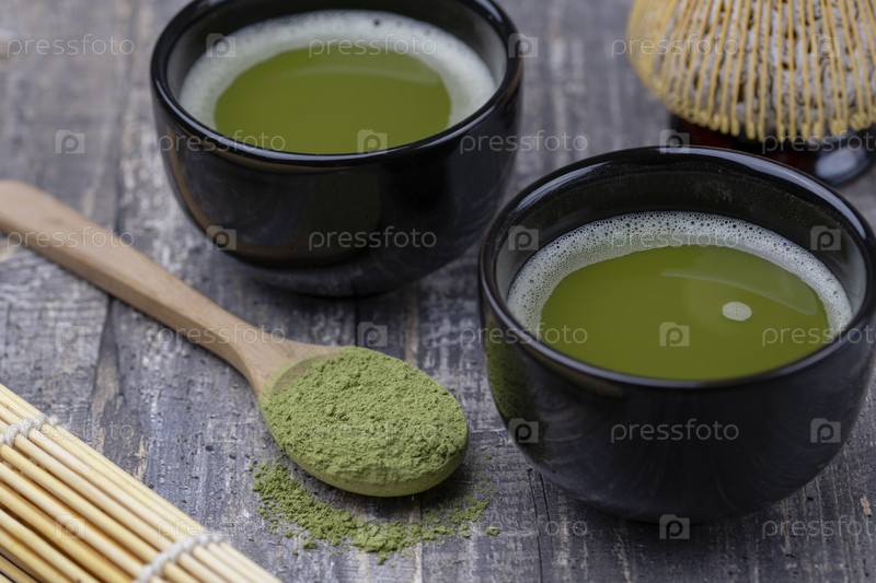 Крупный план матча традиционного японского зеленого чая. Сосредоточьтесь на сухом чае маття в деревянной ложке, венчике для взбивания и чае в чашке на заднем плане в размытом виде, деревянном фоне и бамбуковой циновке. Японский стиль