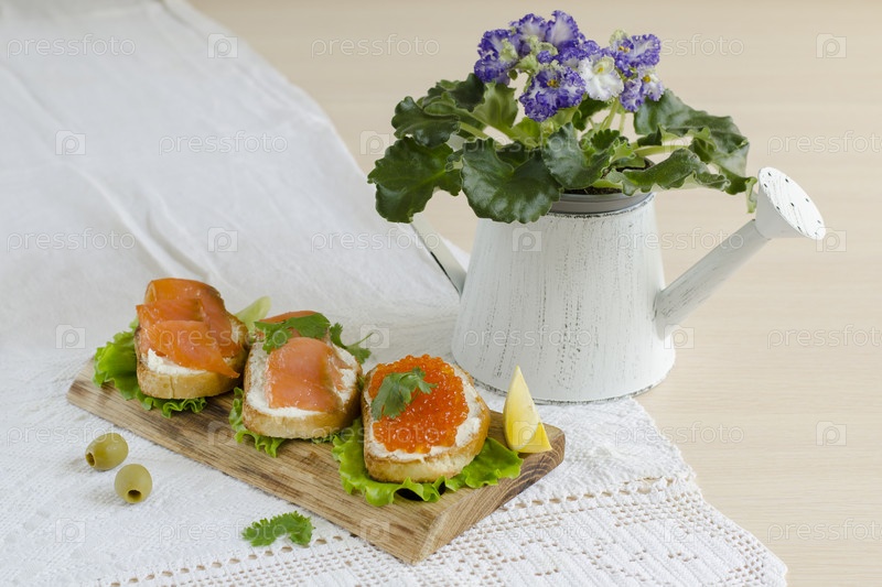 Бутерброды с икрой и красной рыбой на поджаренных тостах сервированы на деревянной доске крупным планом