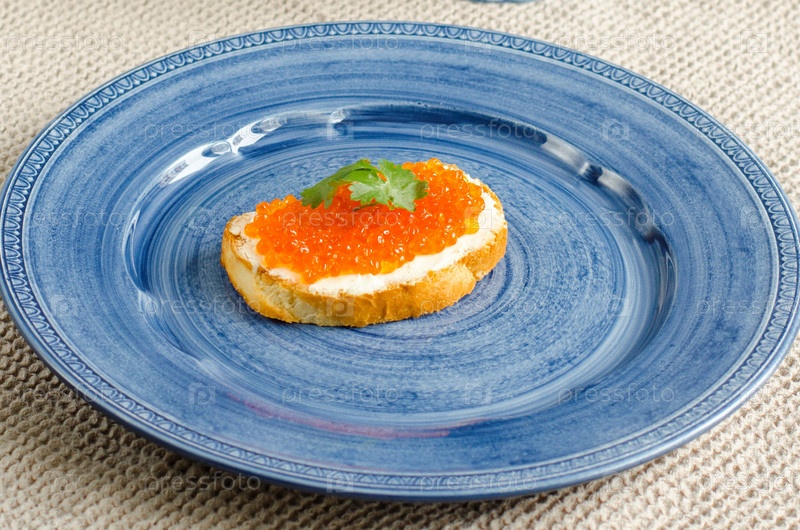 Бутерброд с икрой на поджаренном тосте лежит на синей тарелке крупным планом