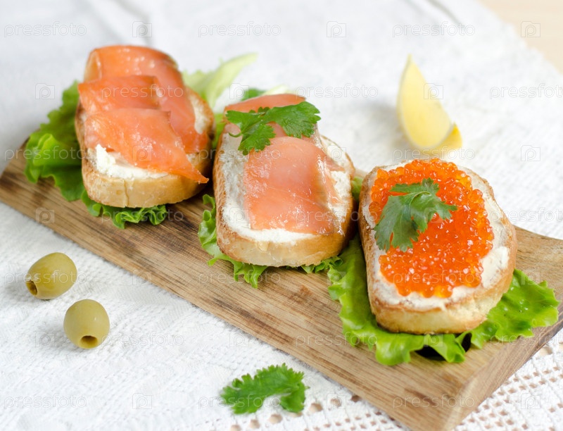 Бутерброды с икрой и красной рыбой на поджаренных тостах сервированы на деревянной доске крупным планом
