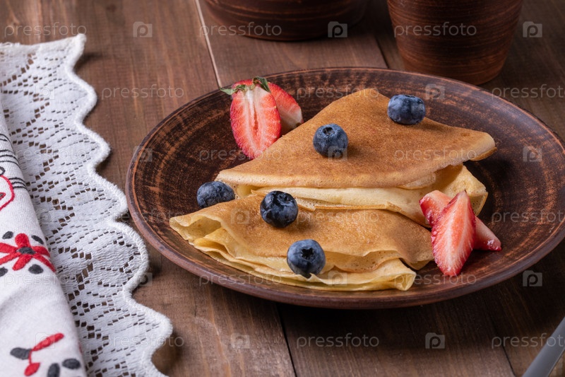 Русский традиционный праздник Масленица - проводы зимы и встреча весны. Блины с клубникой и черникой, кувшин с молоком, керамическая посуда в стиле рустик, крупный план