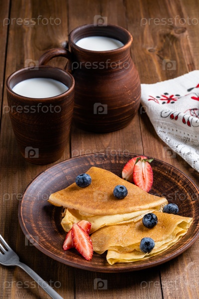 Русский традиционный праздник Масленица - проводы зимы и встреча весны. Блины с клубникой и черникой, кувшин с молоком, керамическая посуда в стиле рустик, крупный план