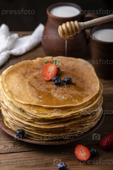 Русский традиционный праздник Масленица - проводы зимы и встреча весны. Блины с клубникой и черникой, кувшин с молоком, керамическая посуда в стиле рустик, крупный план