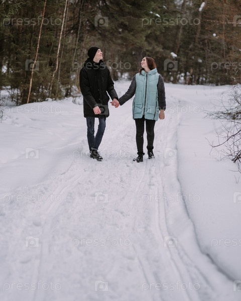 Влюбленная пара подростков, гуляющих в зимнем лесу