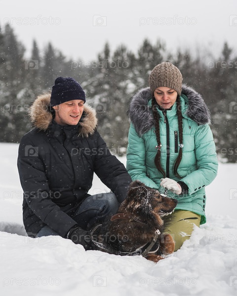 Милая пара развлекается со своей собакой в зимнем лесу