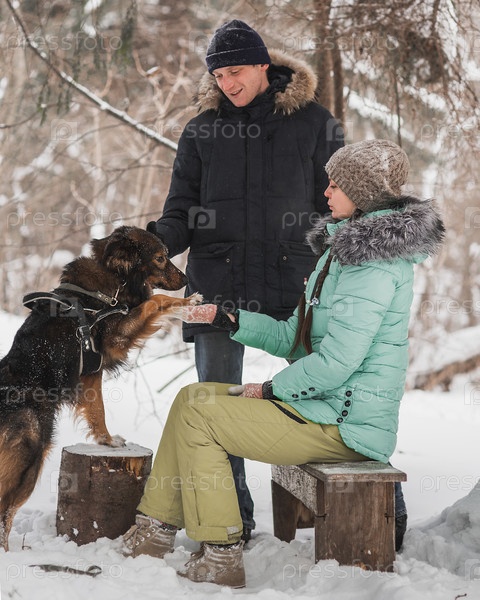 Счастливая молодая пара гуляет с собакой в лесу в зимний день