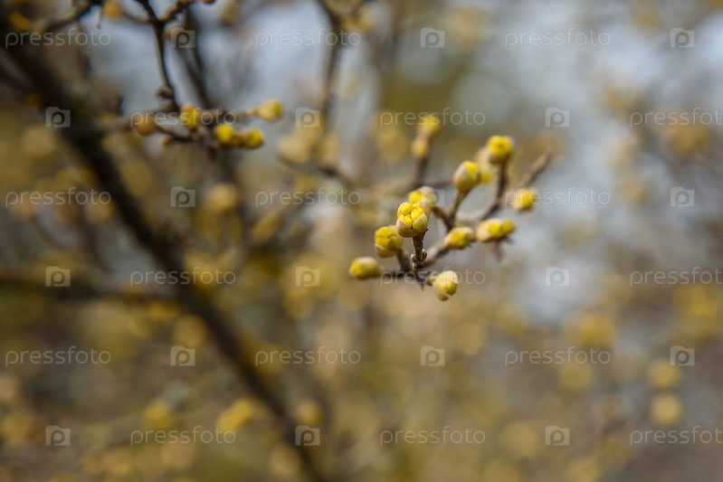 Ветви с цветочными бутонами европейского кизиля или Cornus mas в начале весны