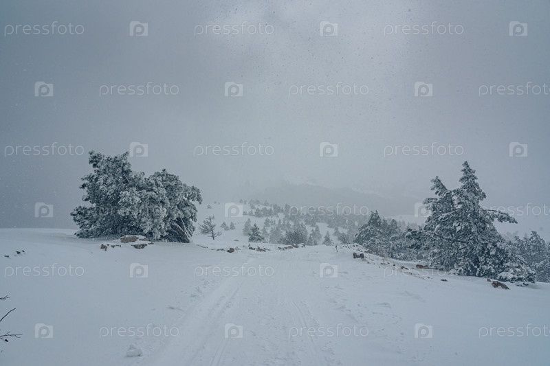 Заснеженный лес на вершине горы Ай-Петри после метели. Крым