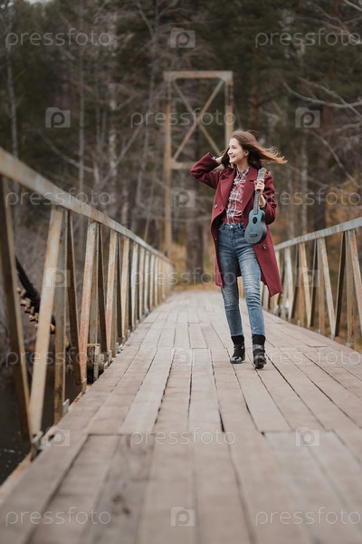 Молодая счастливая женщина гуляет с гитарой укулеле по мосту в осеннем лесу