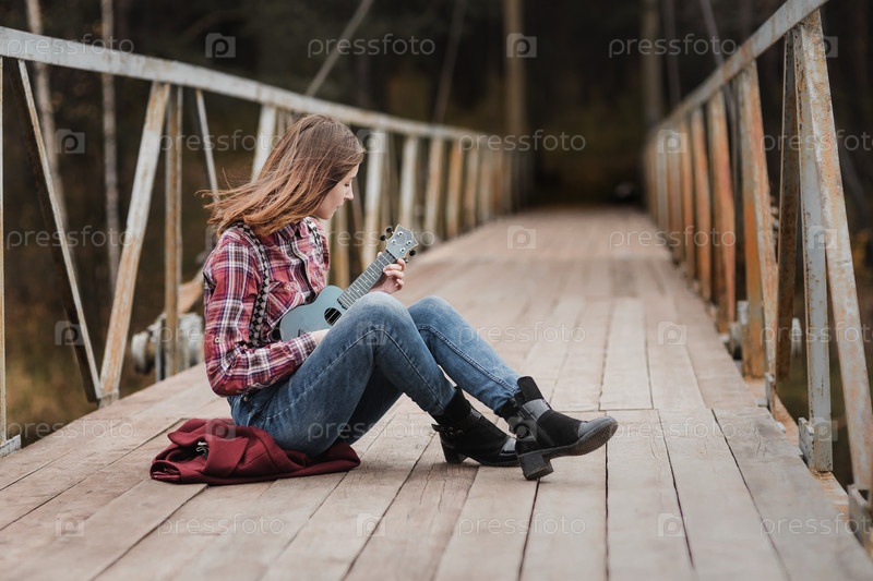 Молодая женщина сидит и играет на гитаре укулеле на мосту в осеннем лесу