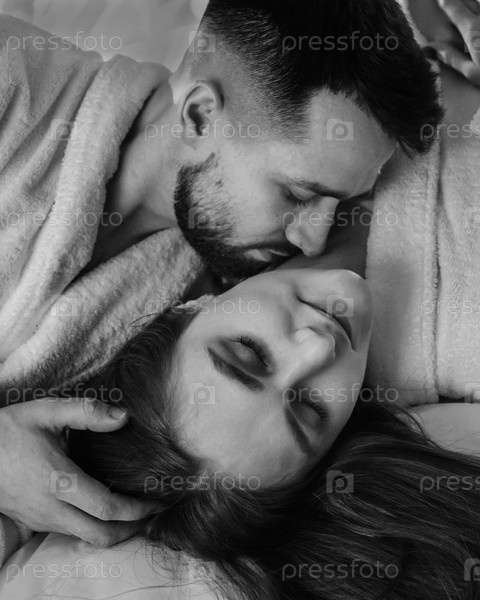 Портрет молодой сексуальной любящей пары в халатах, отдыхающей на кровати в отеле. Черное и белое
