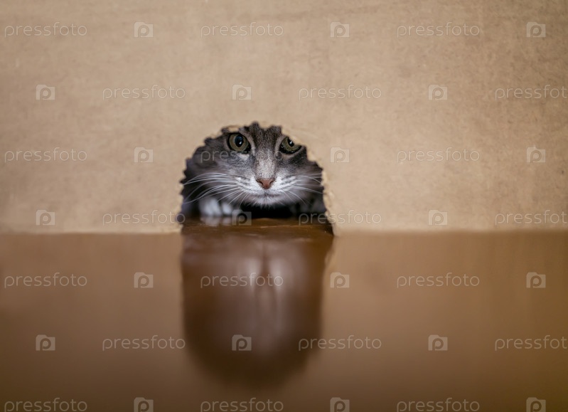 Портрет милого полосатого кота-охотника, заглядывающего в дыру в стене в поисках мышиной добычи