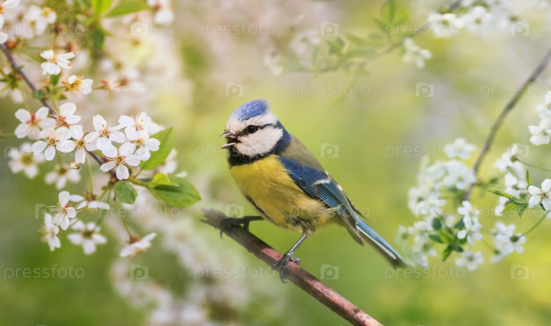 Синица сидит в цветущем весеннем саду в солнечный день и поет песню
