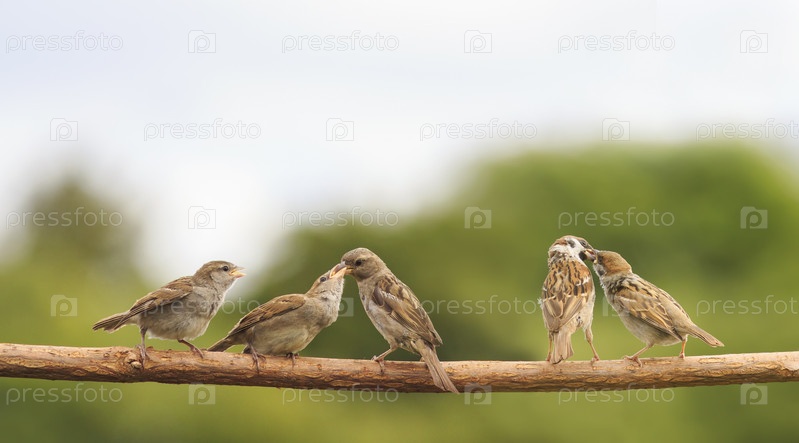 Птицы воробьи кормят своих птенцов на ветке в летнем солнечном саду