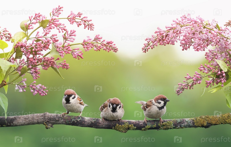 Забавные птички сидят в весеннем саду под ветвями цветущей сирени