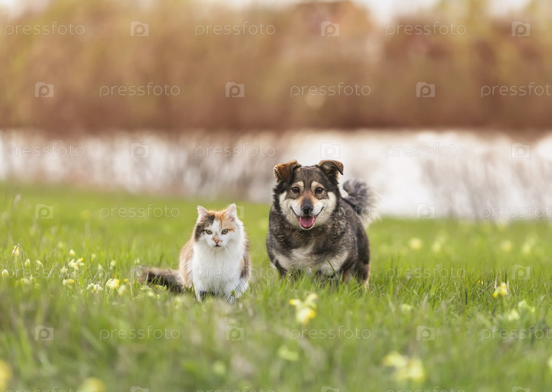 Друзья собака и пушистый кот гуляют по зеленой траве на солнечном весеннем лугу