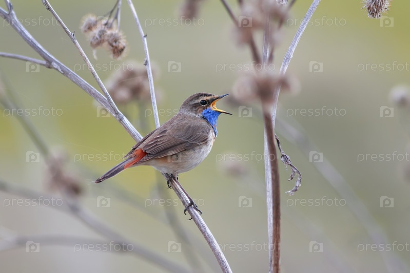 Красивый самец певчей птицы варакушка сидит на ветвях лопуха и поет