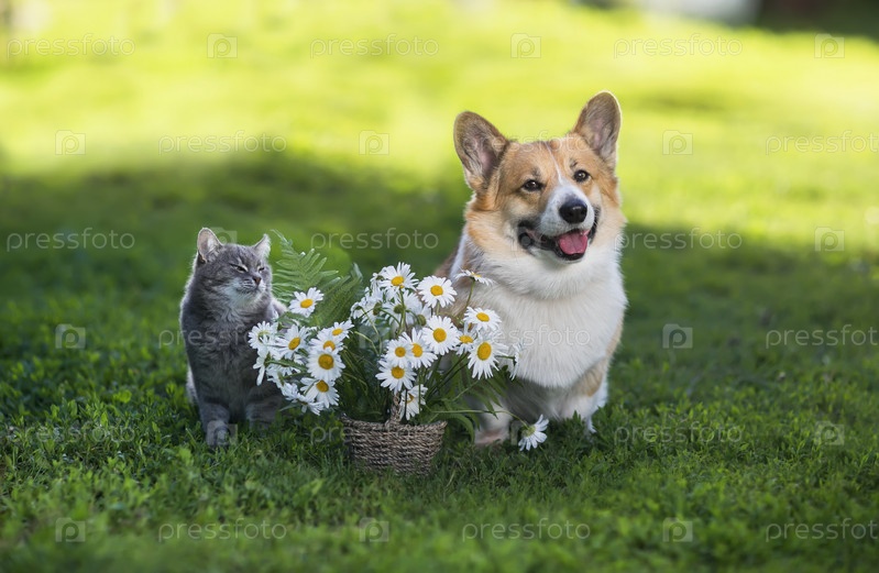 Друзья животные кошка и собака корги сидят на зеленом солнечном лугу с корзиной белых маргариток