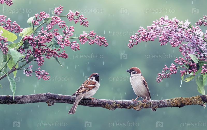 -два воробья сидят на ветке цветущей сирени во время дождя