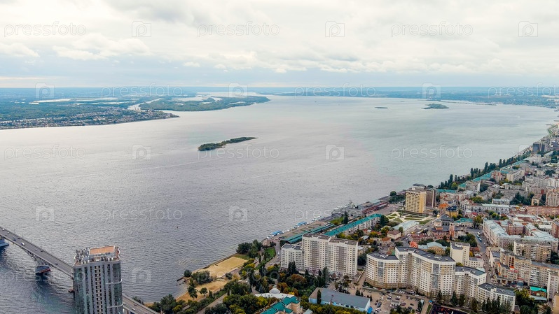 Саратов, Россия. Панорама города Саратова в пасмурную погоду, вид с воздуха