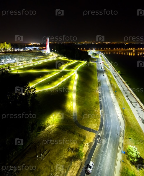 Калуга, Россия. Космическая ракета. Набережная Яченского водохранилища. Вид с воздуха ночью