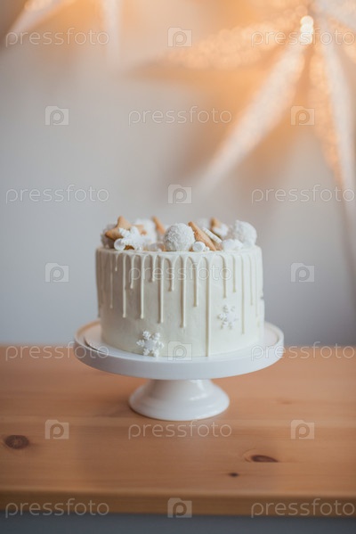 Рождественский торт с кокосовыми конфетами и печеньем на керамической подставке