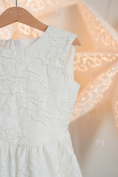 Белое праздничное платье висит на деревянной вешалке