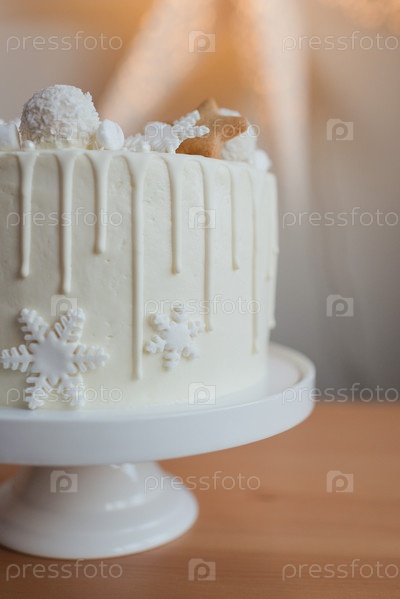 Рождественский торт с кокосовыми конфетами и печеньем на керамической подставке