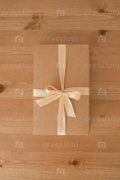 Коробка для творчества, украшенная лентой на деревянном столе, натуральная упаковка, подарок
