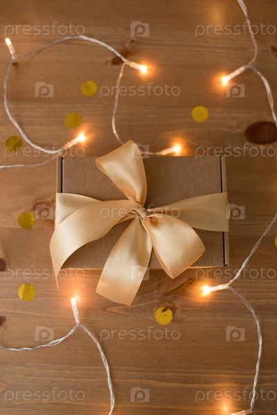 Коробка для творчества, украшенная лентой на деревянном столе, натуральная упаковка, подарок