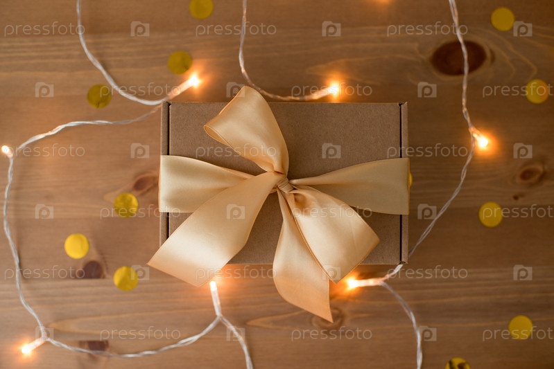 Коробка для творчества, украшенная лентой на деревянном столе, натуральная упаковка, подарок