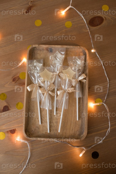 Леденец на палочке в форме звезды на деревянном столе
