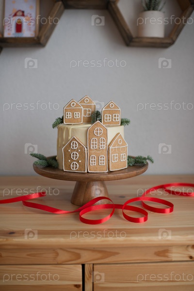 Рождественский торт с пряничными домика и на деревянном столе