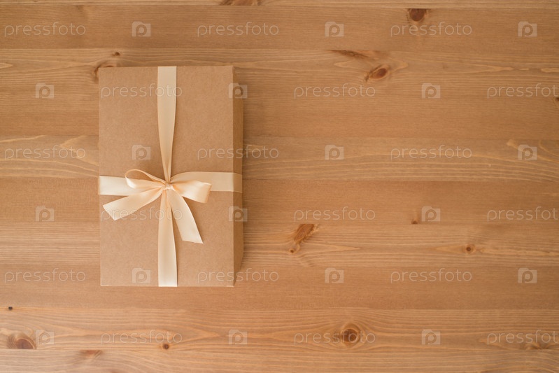 Коробка для творчества, украшенная лентой на деревянном столе, натуральная упаковка, подарок
