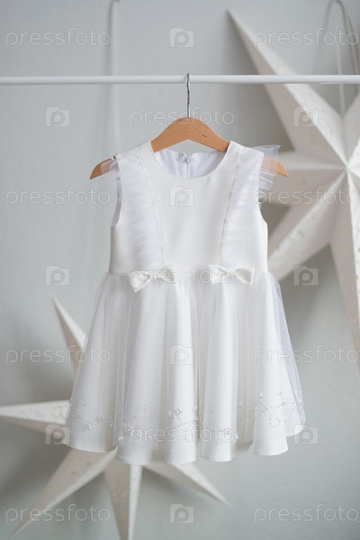 Белое праздничное платье висит на деревянной вешалке
