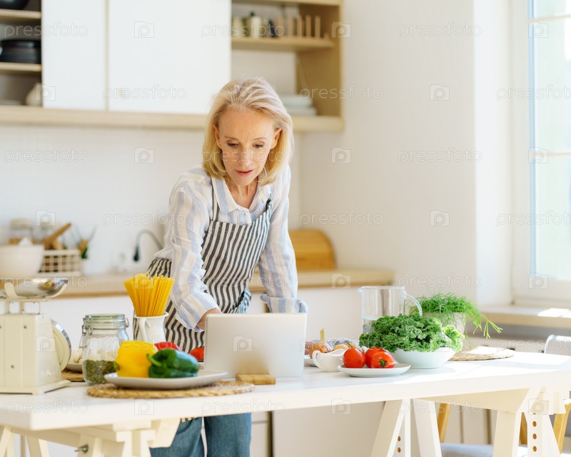 Пожилая женщина смотрит кулинарный онлайн-класс или видеорецепты, готовя дома на современной кухне