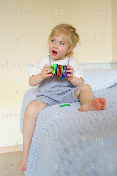 Малыш играет с магнитной строительной игрушкой, сидя на кровати